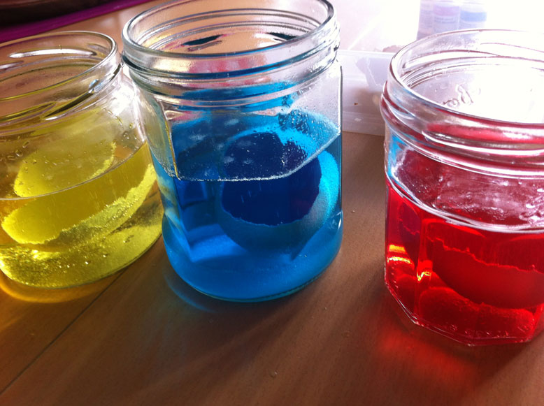 Jetzt ist es Karfreitag und ich habe nicht mal Eierfarben gekauft (nicht, dass wir die selbst in der Drogerie verkaufen würden … :-( ) Zwiebelschale wäre noch eine Möglichkeit – aber das habe ich im Moment nicht genug da … was ich aber da habe, von früheren Bastelarbeiten mit Junior ist flüssige Lebensmittelfarbe. Rasch gegoogelt – ja, auch damit kann man Eier färben.