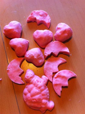 8. aus dem Block mit einem scharfen Messer kleinere Seifen schneiden. Alternativ könnte es auch sehr schön aussehen, wenn man grössere Formenausstecher hätte. Seifenreste kann man wieder einschmelzen und in Formen füllen.