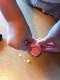 Man kann ihn in Sandförmchen vom Strandurlaub pressen (in dem Fall lohnt es sich, etwas Mandel-Öl aufzupinseln, damit er nicht klebt)