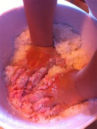 diese Mischung gibt man zu den Seifenflocken und mischt ….