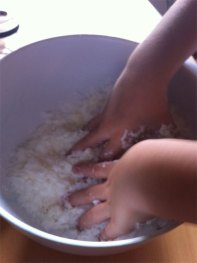 Kleinkinder können das verwenden um den Tastsinn zu schulen – man kann in der Reismischung kleine Gegenstände verstecken, die sie heraussuchen müssen. Grössere Kinder können mit Leim und Reis farbige Bilder kreieren. Oder man kann es schichtenweise (wie Sand) in hübsche Gefässe abfüllen und die als Dekoration brauchen.