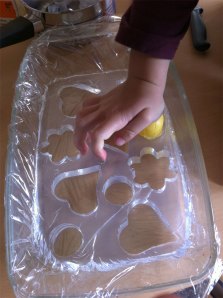 Weil ich noch Masse übrig hatte (unsere Eiswürfelformen sind offenbar zu klein) habe ich noch mit Guetzliformen experimentiert. Das geht auch – es ist einfach schwerer, die Bömbchen da wieder rauszubekommen.