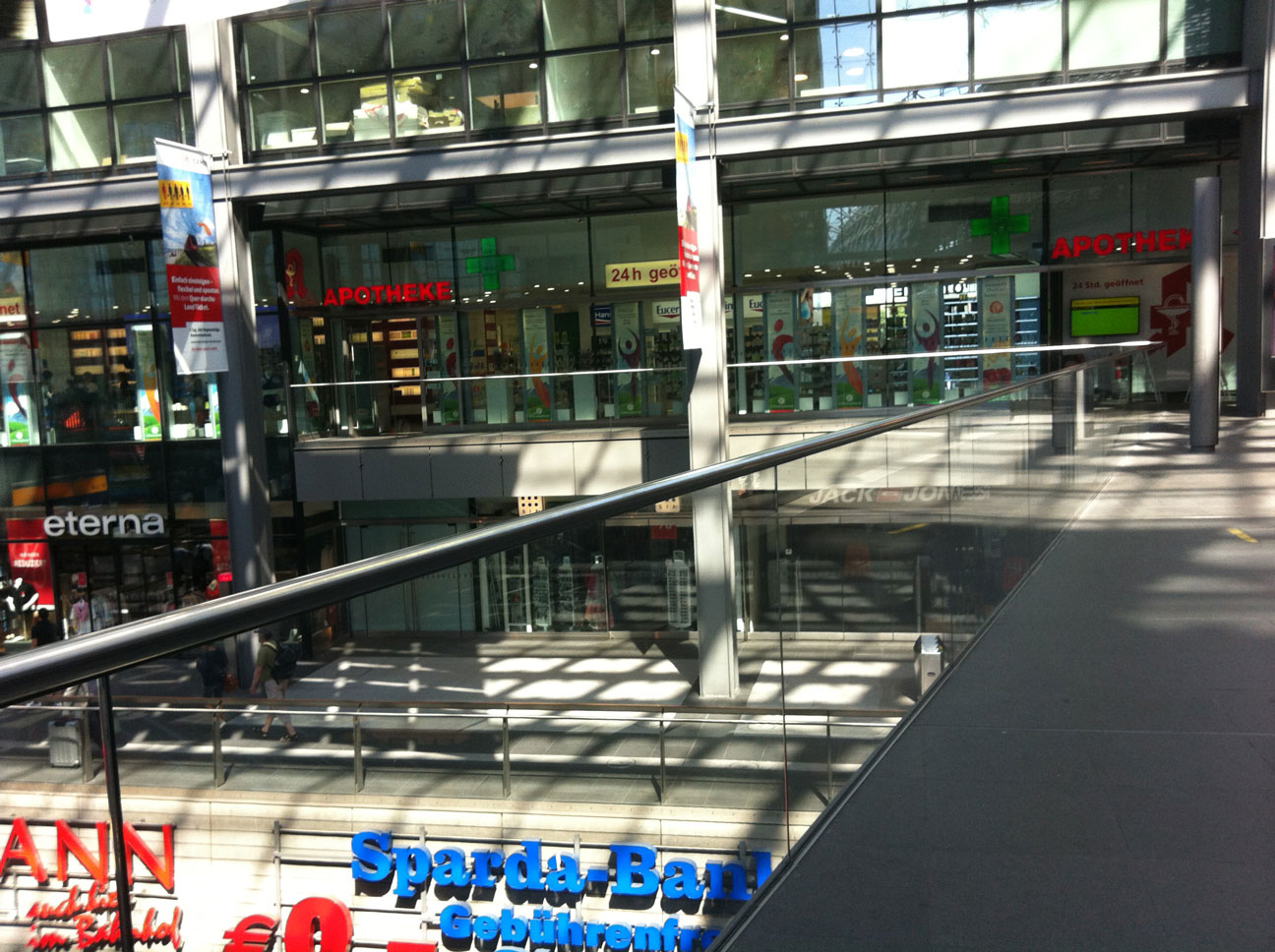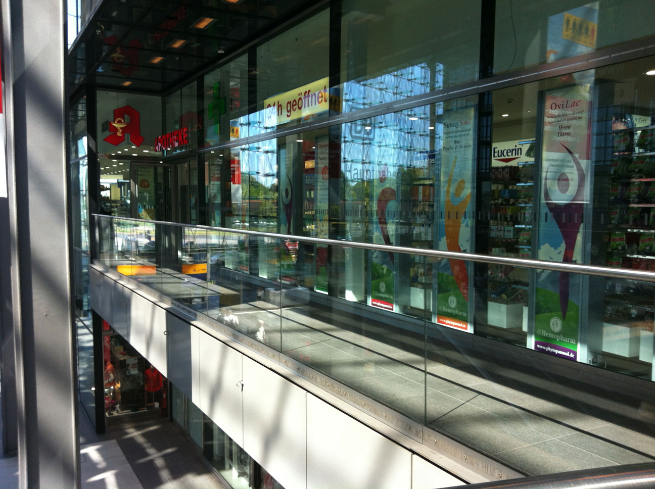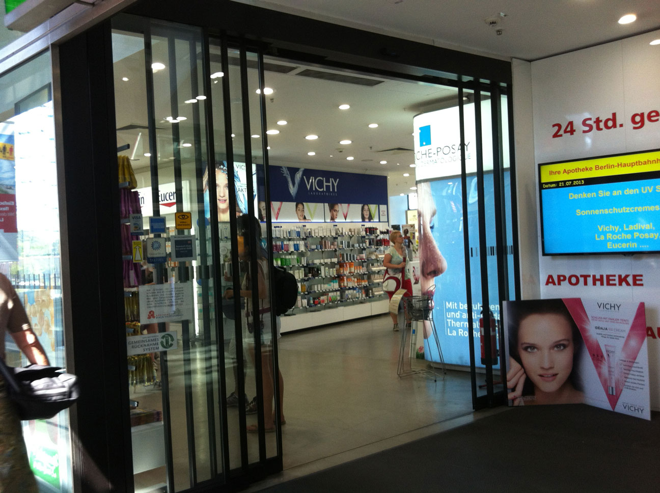 Auf den Fotos sieht man die optisch eher unspektakuläre Apotheke am Berliner Hauptbahnhof, die aber sicherlich eine der meistbesuchten Apotheken Deutschlands sein dürfte (bei 300.000 Reisenden und Besuchern im Bahnhof pro Tag). Als besonderer Service ist sie 24 Stunden geöffnet, so dass man nicht auf irgendeinen Nachtdienst angewiesen ist, falls man in der Nähe wohnt. Mindestens die Hälfte der ziemlich großen Ladenfläche ist übrigens für nicht-medizinische Artikel wie etwa teure Kosmetik…
