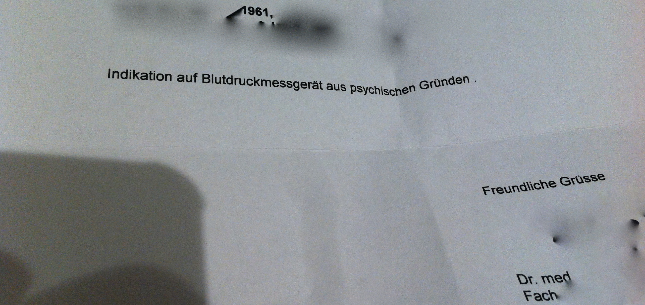 Das oben ist ein Rezept (ja – trotz nettem Gruss vom Arzt drauf) für ein Blutdruckmessgerät.