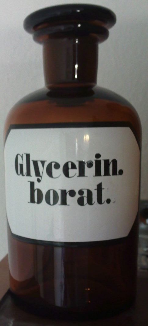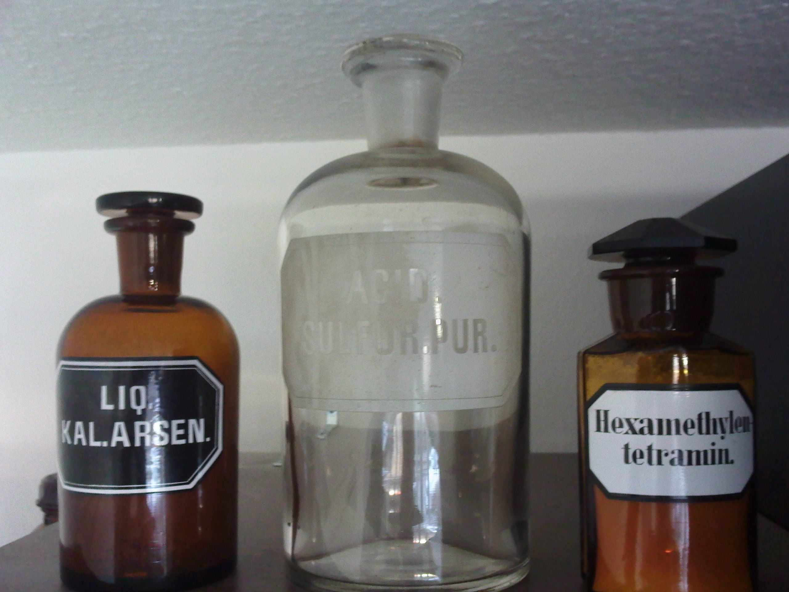 Sowas wie im Bild oben. Da stehen 3 Fläschchen, von Hand angeschrieben mit „Berlinerblau„, „Natriumbichromat -Poison/Gift“ und „Vorsicht Zündstoff“
