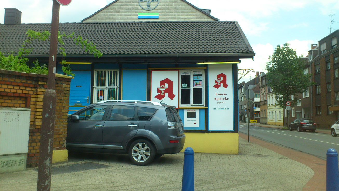 Diesmal war ich Duisburg selbst und fand dort dieses schöne Haus mit der Apotheke drin. Leider – *noch* mit einer Apotheke drin. Ich habe das Plakat in der Scheibe mit fotografiert (leider in der brütend heißen Mittagssonne) – dabei musste ich auch sofort an Gedankenknicks Blog denken.