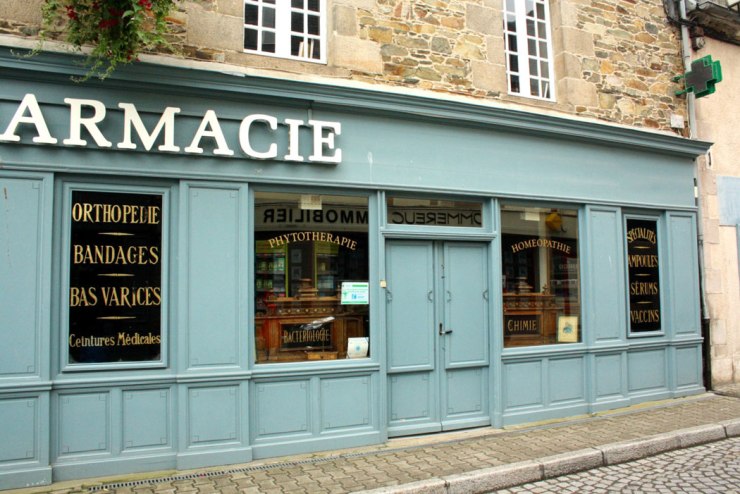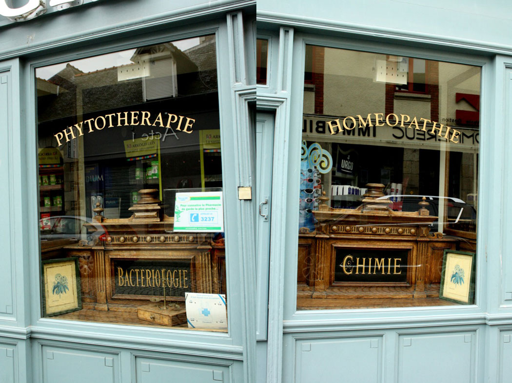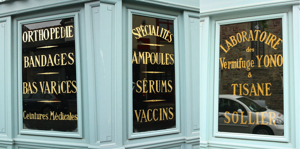 ich schicke dir Fotos einer schönen, alten Apotheke in Paimpol (Bretagne) aus dem letzten Sommer. Aufgefallen waren mir die farbenfrohe türkise Fassade und die alte Fensterbeschriftung. Was da wohl alles beworben wurde ? Das Haus ist ein typisches bretonisches Granithaus. Leider war die Apotheke geschlossen (Mittagspause), aber ein Blick ins Innere zeigte die üblichen, mittlerweile wahrscheinlich europaweit gleichen Arzneimittel und Kosmetika.