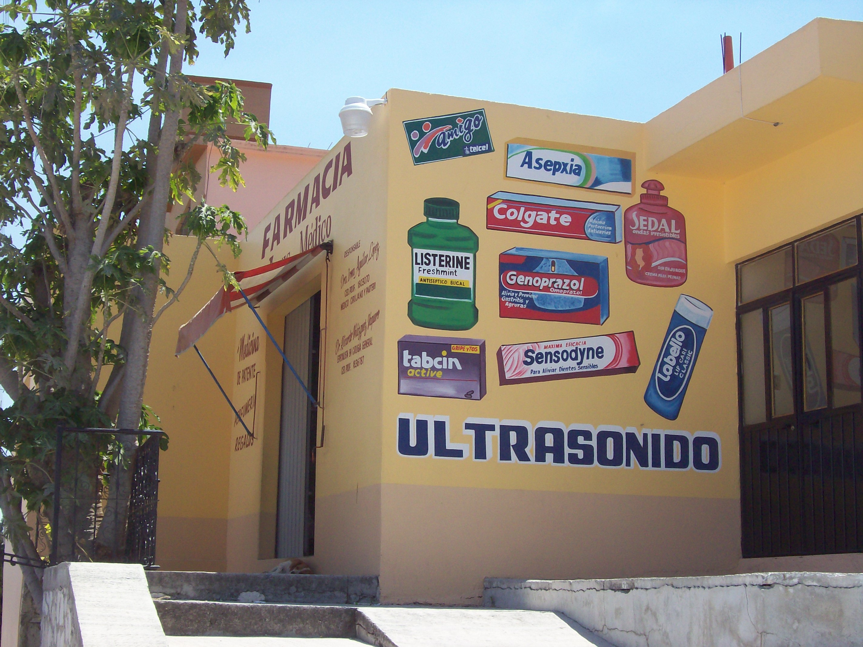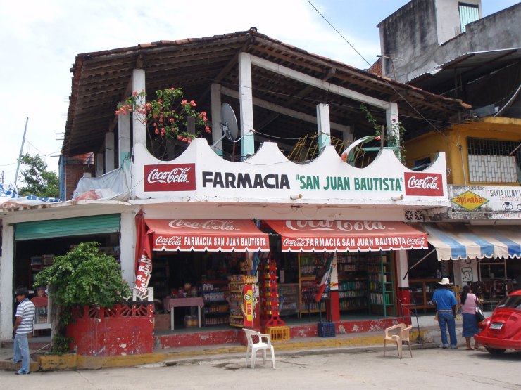 Die Apotheke befindet sich in einem kleinen Dorf in Mexiko – wo man die Hauswände offensichtlich als bunte Werbeflächen verwendet. Erstaunlich: die „Farmacia“ liegt auf der anderen Seite der Welt, aber Listerine, Colgate und Labello erkennt man sofort.