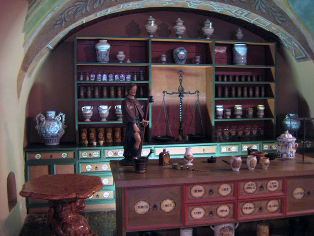 ich war letztens in Budapest. Dort gibt es ein Apothekenmuseum. Laut Reiseführer mit freiem Eintritt, und als Chemiker bin ich natürlich interessiert, also schnurstracks hin. Leider war die Information überholt und wir mussten doch Eintritt zahlen… aber das war es mir wert, schließlich kann ich so mit etwas anderem als nur Apothekenfassaden zum Blog beitragen :)