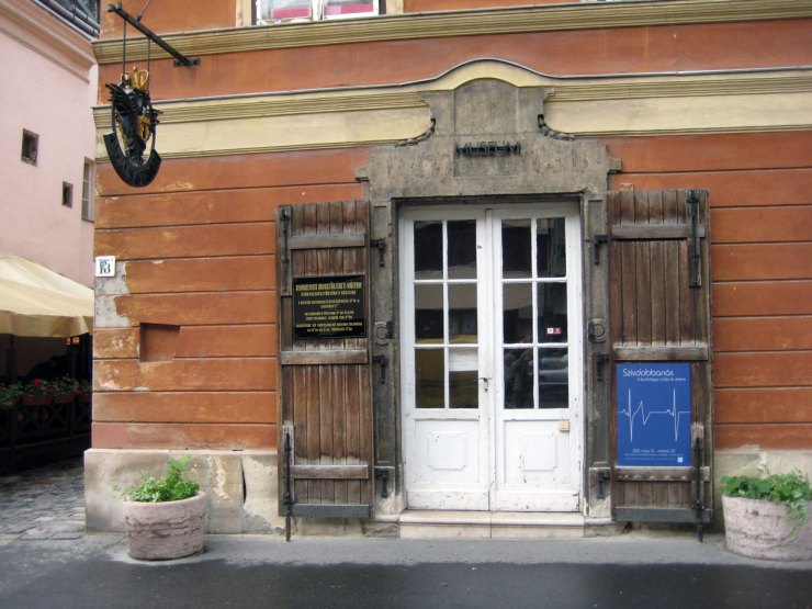 Das Museum befindet sich angeblich in der ältesten bzw. ersten Apotheke Budapests in einem Haus aus dem 15. Jahrhundert. Dort sind die Arbeitsfläche eines Apothekers der alten Schule sowie jede Menge Utensilien und auch „Medikamente“ ausgestellt, zum Beispiel der Kopf einer Mumie für das damals beliebte Mumienpulver. Ebenfalls gezeigt: ein Bild einer damaligen Apothekerin. Laut Museum haben vor dem Aufkommen des „richtigen“ Apothekerberufs Nonnen diese Aufgabe übernommen.