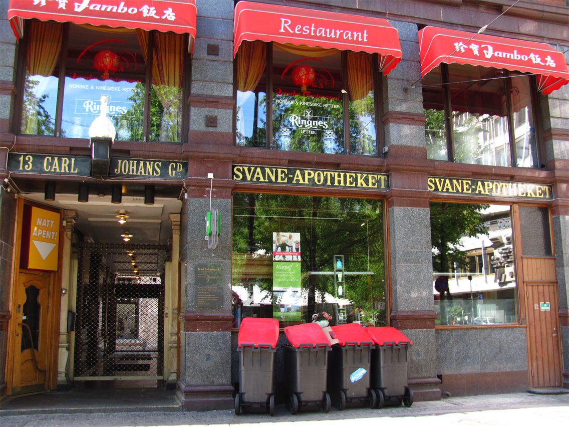 Die 1. Apotheke ist die Schwanen-Apotheke, die an einer Art Passage zwischen Karl Johans Gate, der bekannten Osloer Fussgängerzone, und Stortorvet („Großer Platz“) liegt. Leider mit Mülltonnen und es war auch noch Sonntag deswegen war die Apotheke geschlossen. Die Innenausstattung finde ich ziemlich gelungen.