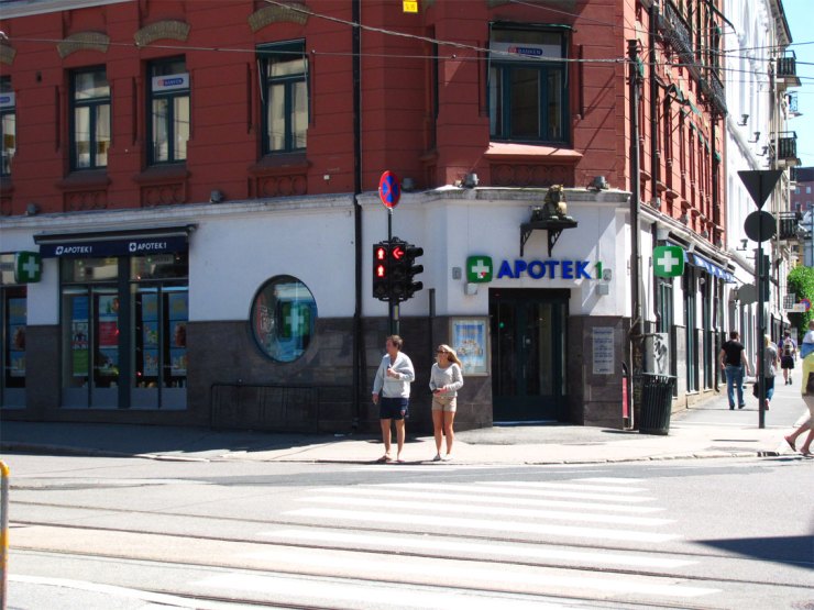 Apotek 1 Sfinxen an der Kirkeveien (Kirchstraße) in der Nähe des bekannten Vigeland-Skulpturenparks. Namentlich abgestimmt mit einer Sphinx über dem Eingang. Das runde Bullaugen-Schaufenster ist sicher unpraktisch zum dekorieren…