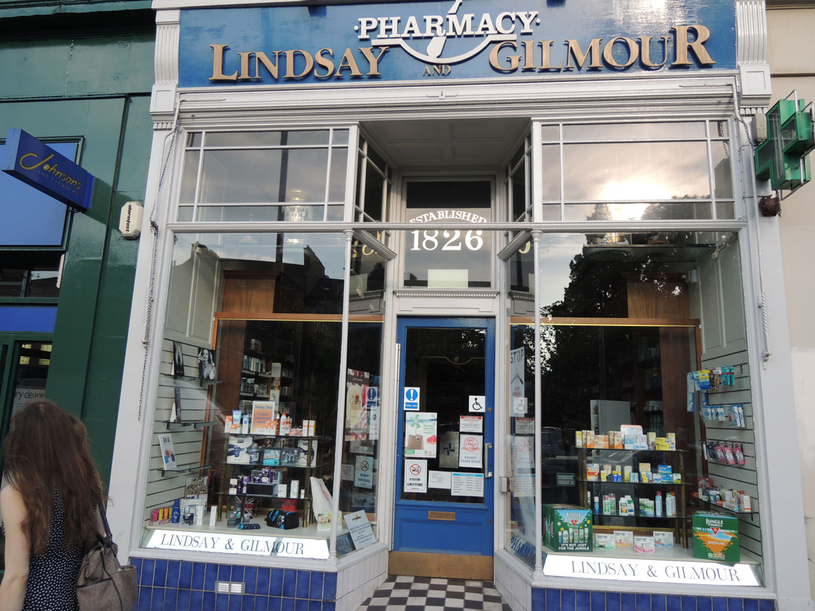 die andere Apotheke ist die Lindsay & Gilmour Apotheke, die, wenn man der Anschrift glaubt, seit 1826 besteht. Die Apotheke hat im übrigen keinen Tiegel über der Tür, sondern nur das grüne Kreuz an der Seite. die Auslagen auf Augenhöhe waren nichts besonderes und die älteren Gefäße, die oben im Fenster stehen, sowie die ältere Einrichtung in der Apotheke erkennt man leider wegen der Spiegelung im Fenster nur schlecht. Die Apotheke befindet sich ebenso im Leith Walk in Edinburgh.