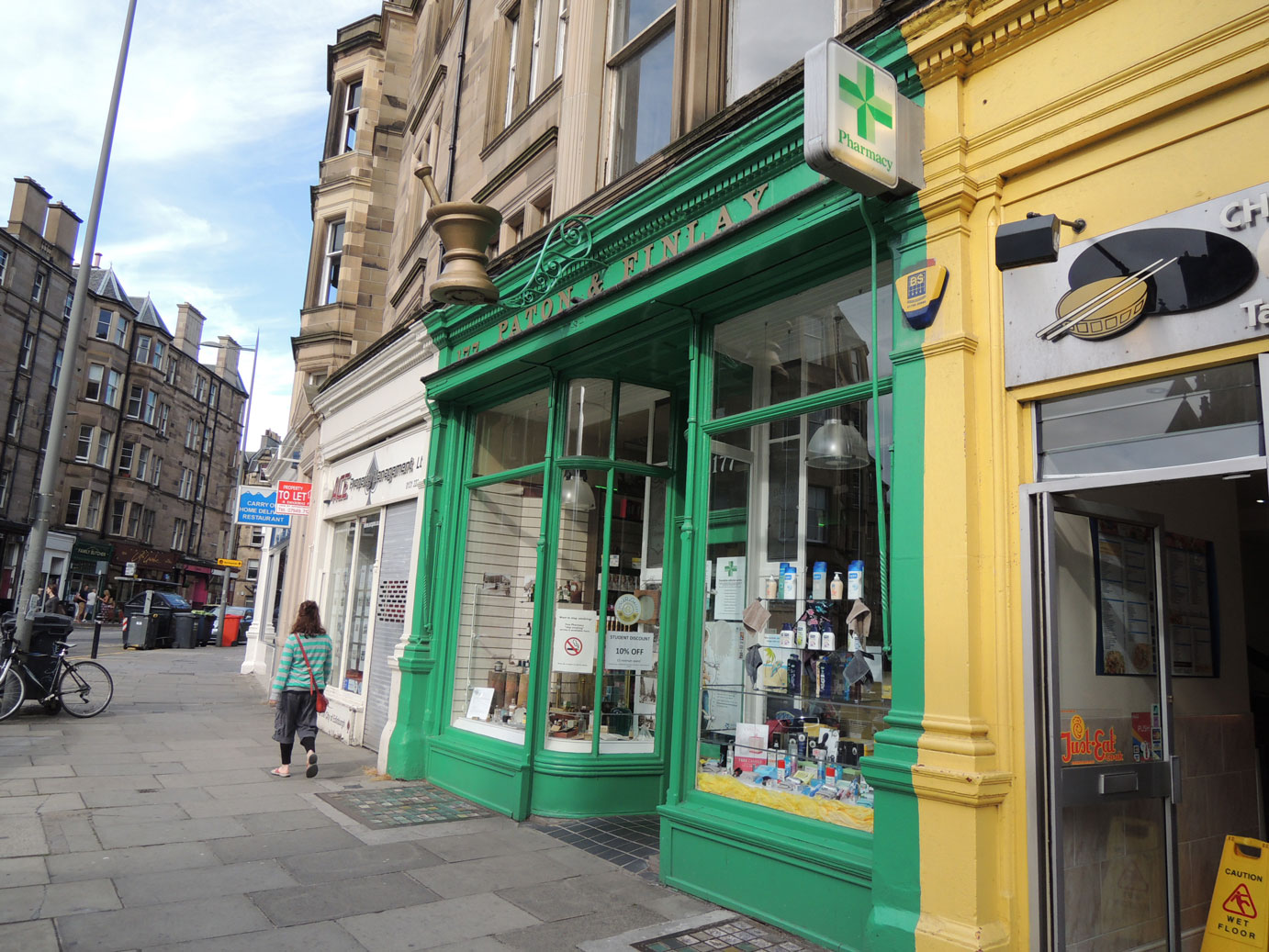 ich glaube, dass du die Apotheke, aus Edinburgh, Stadtteil Bruntsfield noch nicht in deinem Blog hattest. Ich habe 2 Aufnahmen, einmal die Apotheke grob in Gesamtansicht (wo das Apothekenkreuz zu erkennen ist und der Tiegel über der Tür) und eine Aufnahmen des interessanten Schaufensters (das andere Schaufenster hatte nur das große Kosmetikangebot)