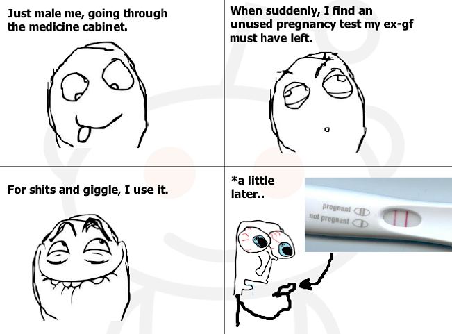 So tatsächlich passiert in Amerika: Mann findet einen Schwangerschaftstest, den seine Ex-Freundin im Schrank vergessen hat und denkt: „Bevor ich den wegwerfe, pinkel ich doch selber rasch drauf.“ Zu seiner Überraschung zeigt der Test Positiv an – was sein Freund als Comic verarbeitet und auf Reddit postet.