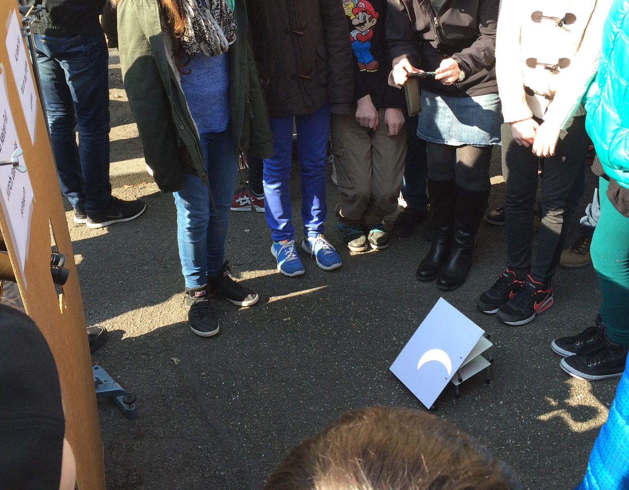Ein Bild von Anne in Bruchsal, das ich super finde! ein Physikkollege und sein Astronomiekurs hatten eine Projektion im Schulhof aufgebaut, wo jeder gefahrlos auch ohne Brille gucken konnte.