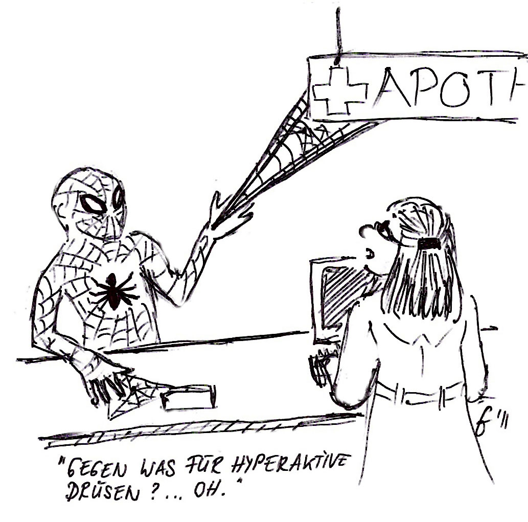 Und für die Puristen: Ja, ich weiss schon. Im Original-Comic hat Spiderman keine Spinndrüsen sondern er findet einen Weg seine Netze künstlich herzustellen. Aber so … ist es lustiger :-)