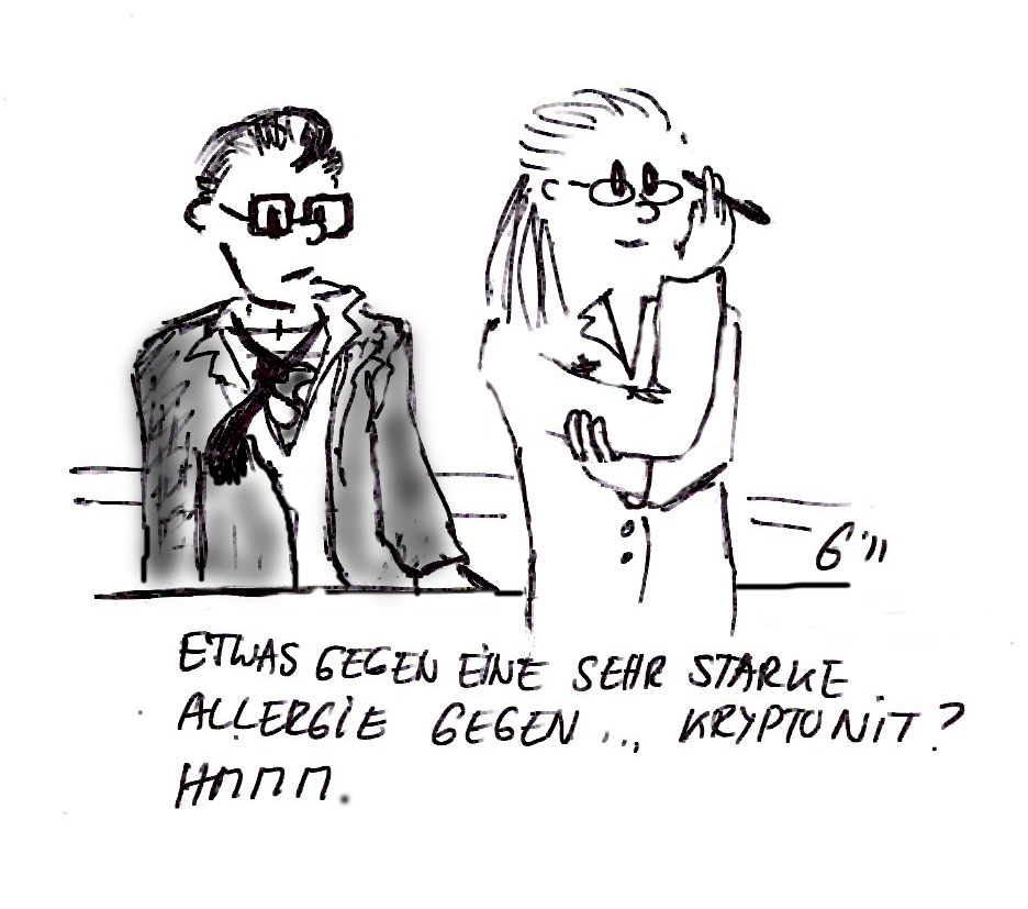 Eine Menge meiner Cartoons entstehen ja aus dem Gedanken heraus: „Was wäre wenn …“ in dem Fall – wenn ein Superheld in die Apotheke käme.