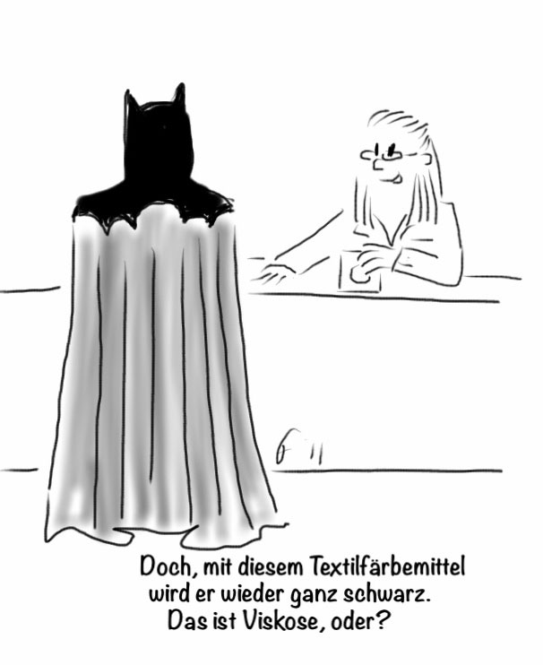 Batman braucht diesmal nichts aus der Apotheke, aber etwas aus der Drogerieabteilung, damit sein Cape wieder schön schwarz ist: