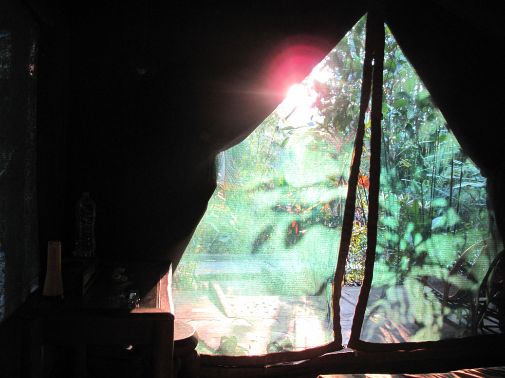 Das ist übrigens der Blick am Morgen aus unserer Unterkunft im Elefantencamp: ein Zelt – innen luxuriös eingerichtet mit festem Bett samt Matratze und einer gemauerten Toilette und Dusche dahinter.
