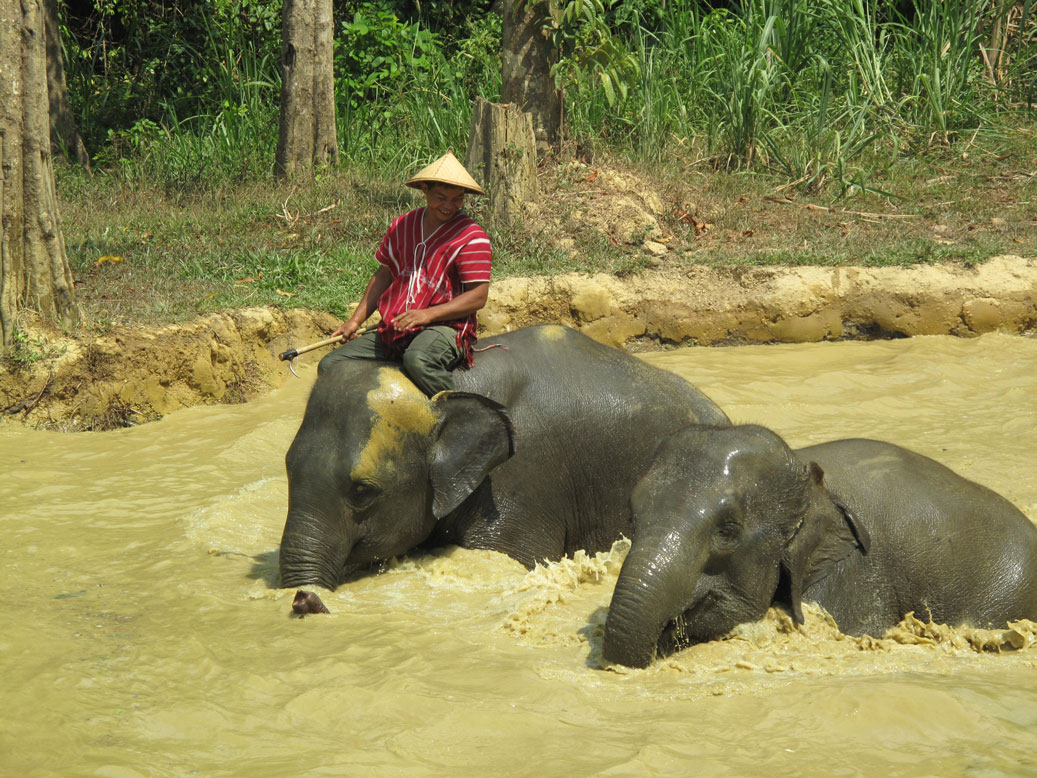 Vor dem waschen muss der Elefant aber erst mal schmutzig werden. Das macht er (mit Vergnügen) im schlammigen Tümpel. Der Mahout hat ihn kaum mehr aus dem Wasser gebracht …