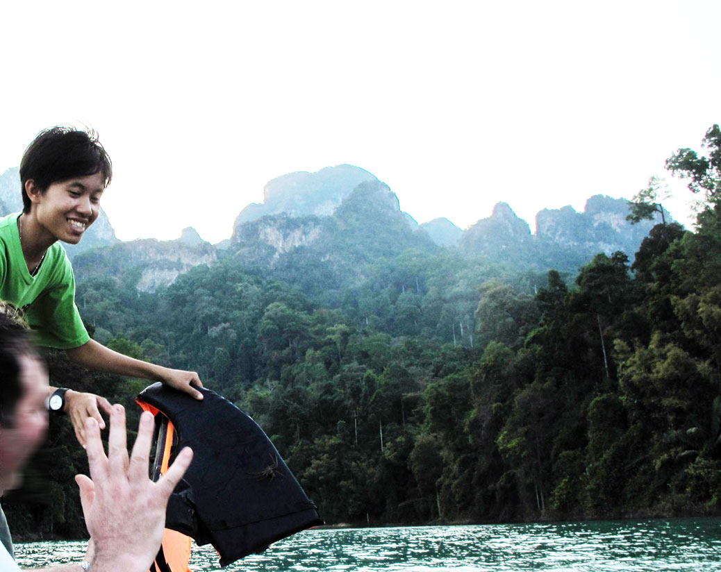 Das war ein kleiner Zwischenfall auf dem Weg zurück zum Camp von Wandern. Transfer per Longtailboot … und wenn man auf dem Wasser ist, soll man (so ist die Vorschrift) Schwimmwesten anziehen. Ich habe darauf verzichtet, aber die Frau hinter mir war buchstabentreu und griff sich eine der Westen … nur um sie praktisch sofort mit einem kleinen Aufschrei ins Wasser zu schleudern. Vorher haben wir schon einen Hut so verloren, warum sie jetzt absichtlich etwas in den See wirft war uns nicht klar.