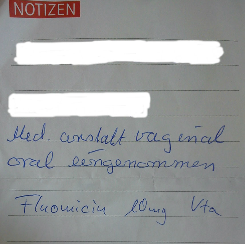 Ich rief also zurück und hatte eine Frau am Telefon, die nicht ihren besten Tag hatte und ihre Vaginaltabletten (Fluomicin, Wirkstoff Dequaliniumchlorid) geschluckt hat. Ob das denn schlimm wäre?