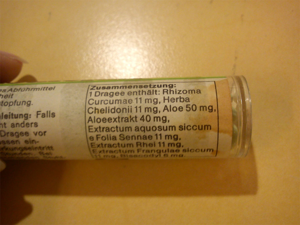 Von daher -es handelt sich ja um den Gesamtextrakt (mit etwa 0.3-0.5% Alkaloidgehalt), sind wir noch nicht im gefährlichen Bereich — sofern man sich an die Dosis hält. Trotzdem würde ich mich hüten, hier (wie auf der Dose) von einem unschädlichen (weil pflanzlichen?) Mittel zu reden … auch auffallend: da steht nichts mehr von abführender Wirkung – dafür gibt es heute auch besser wirksameres. Vielleicht bezog sich die „milde Wirkung“ auch auf das..